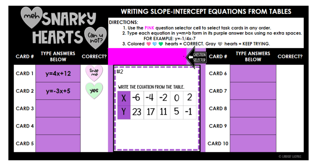 If they are wrong, they get a gray “snarky” heart. My classes did this prior to Valentine’s Day to test it out before I listed this resource and my students loved it. Even my students who could get them all right were intentionally entering in a wrong answer on each question first just to see the snarky Valentine messages first.