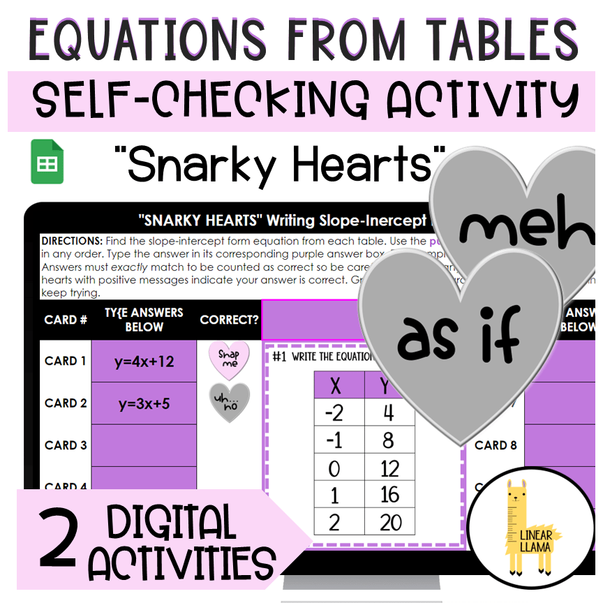 Check out these two that I made for Valentine’s Day. Both have a mix of vertical and horizontal tables but one has the y-intercept given on its tables whereas the other one has students solve for they y-intercept each time.
